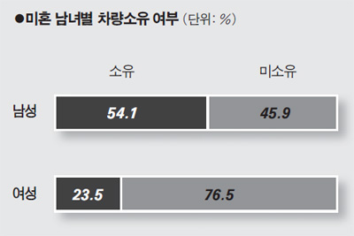 대상이다. 응답한 미혼남성의 절반 이상인 54.1%, 미혼여성의 23.5%가 자기 차량을 가지고 있는 것으로