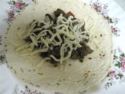 고기가 익으면 또띠야 위에 불고기를 얹고 그 위에 다시 모짜렐라 치즈를 살짝 뿌려줍니다.