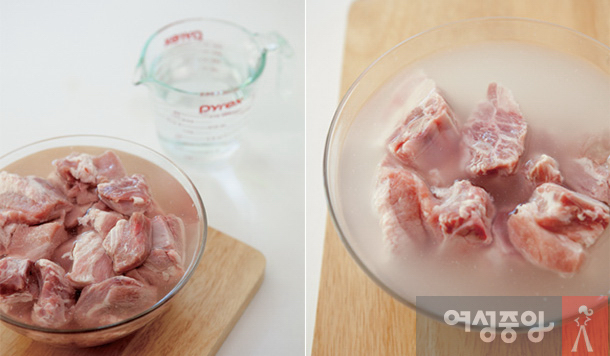 의외의 정석: 찬물을 여러 번 갈고 쌀뜨물로 헹궈 고기 냄새를 없앤다