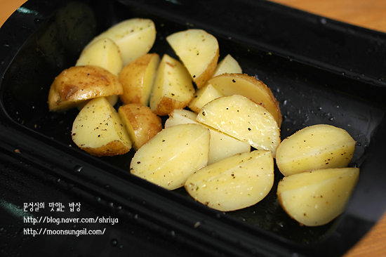 익혀나온 감자에 올리브오일과 허브맛소금(또는 갈릭맛소금 등), 후춧가루를 적당히 넣고서 섞어주기......