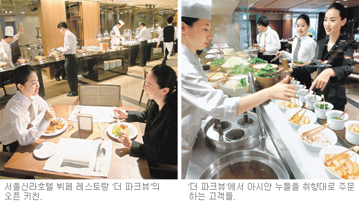 훼밀리아가 지난해 7월 오픈 키친을 도입했다. 서울신라호텔 더 파크뷰는 올 5월 새 단장 오픈을 계기로